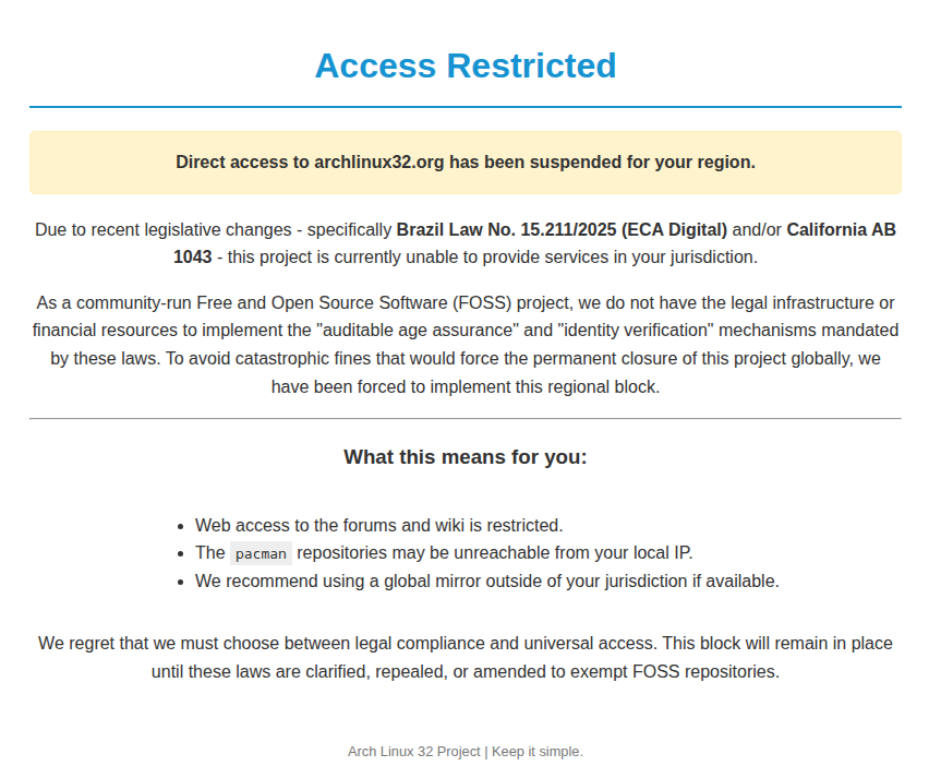 A imagem que ilustra este post é a página do projeto Arch Linux 32, um projeto que mantém uma distribuição Linux para máquinas mais antigas com processadores 32-bits, e é apenas uma casualidade. Como ele, alguns sites deixaram de operar no Brasil e alguns serviços ficaram restrito ou bloqueados no território nacional, como a Rockstar, que suspendeu vendas diretas para brasileiros. Mas isso é o de menos. Não é de hoje que o Governo vem querendo controlar as redes sociais e a internet.