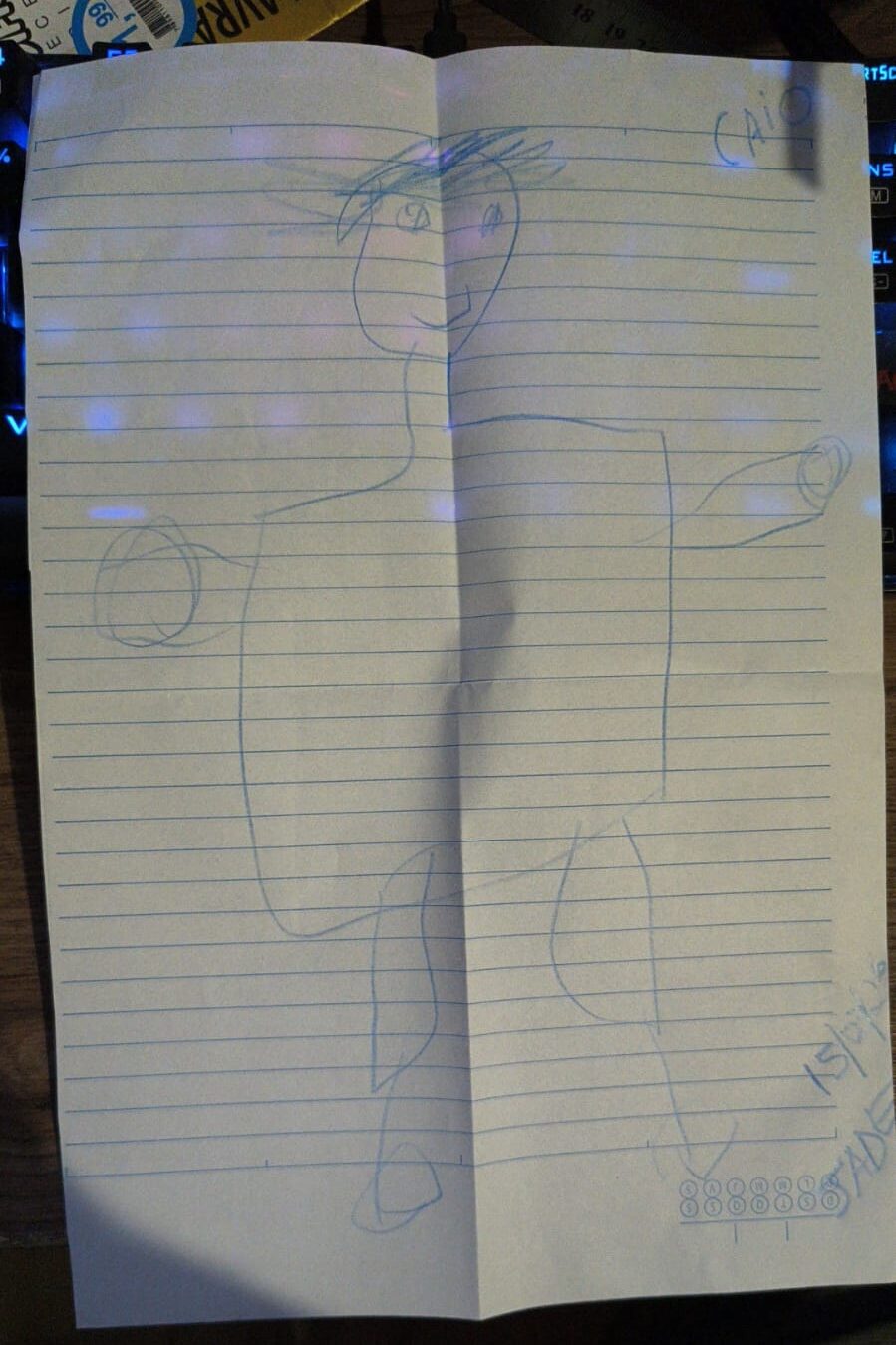 Tenho uma priminha, a Jade, que gosta de desenhar. Fui visitar meu pai neste domingo e ela foi nos ver. Depois de um tempo ela vai pra casa dela, que fica na mesma rua, e volta com um caderno universitário aberto. Ela estende o caderno para mim e diz que é um presente. No caderno tinha retrato de uma figura com o tronco enormo. Pergunto quem é a figura, ela diz que sou eu. Digo que só aceito o desenho se ela assinar e colocar a data. Ela volta pra casa dela e traz assinado e com data.